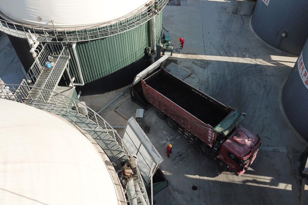 在凉州区城乡有机废弃物资源化处理中心黄羊站,工人们正在把收集来的有机废弃物卸入发酵罐。(新华社记者 范培珅 摄)
