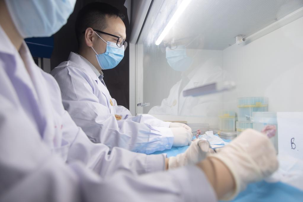 关俊宏在用光学显微镜观察培养皿中的细胞。新华社记者梁军摄