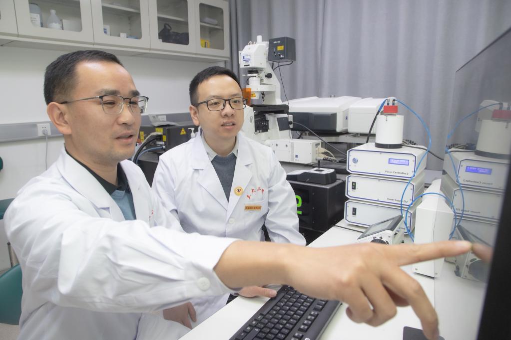 关俊宏(左)和杨靖(右)分析双光子共聚焦显微镜成像实验结果。新华社记者梁军摄