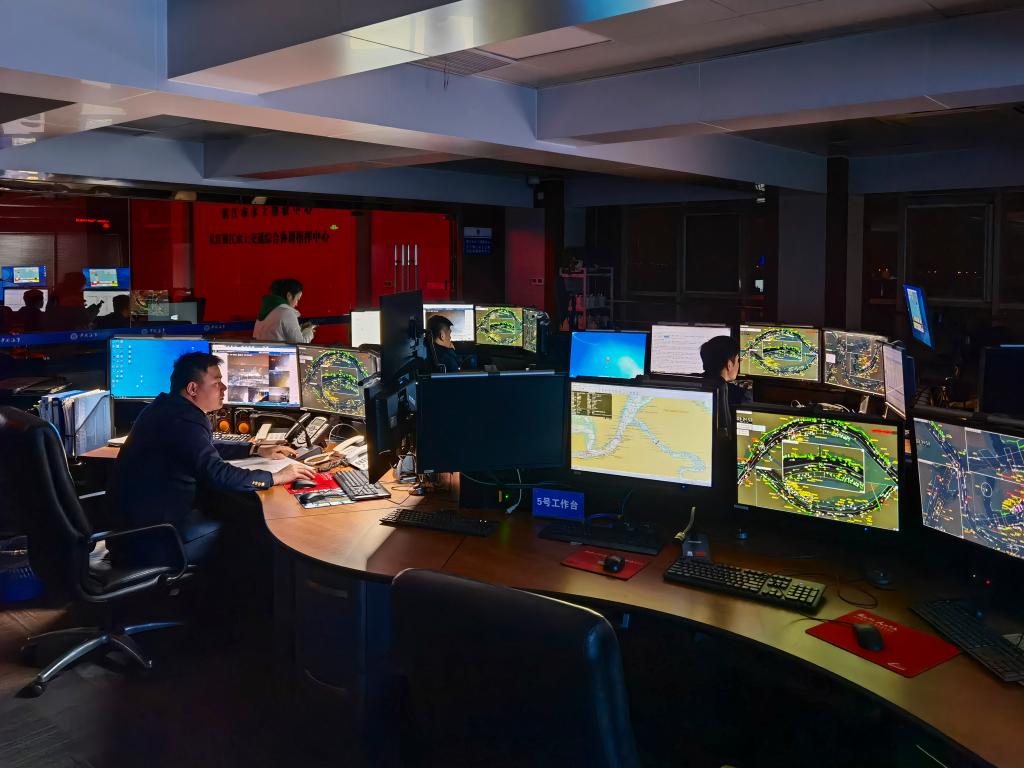渡轮得以安然夜航还有赖于背后的“眼睛”。晚上七八点时,江面上的气温只有两三摄氏度,风吹得更紧了。渡口往东几公里的六圩河口,快速反应处置中心办公室里依然灯火通明。工班长吴哲正通过视频监控系统追踪渡轮的航行情况。