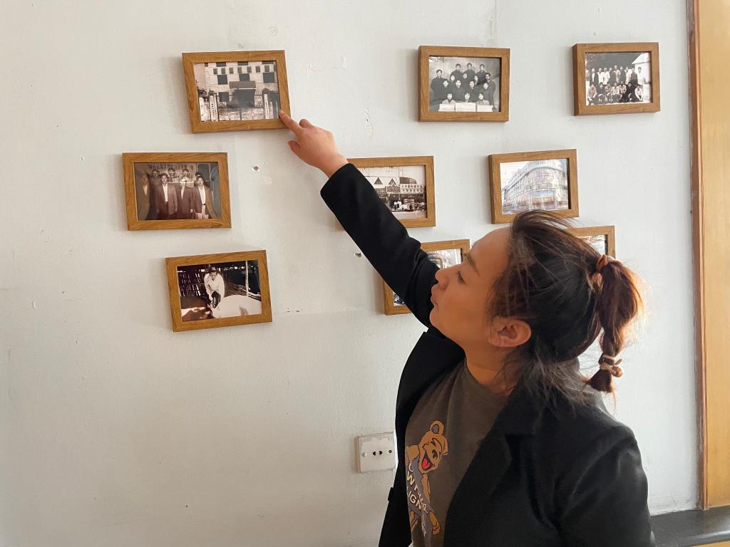 宋雪红在介绍涂谢岭生前制作的村史展览照片。 新华社记者邹大鹏摄