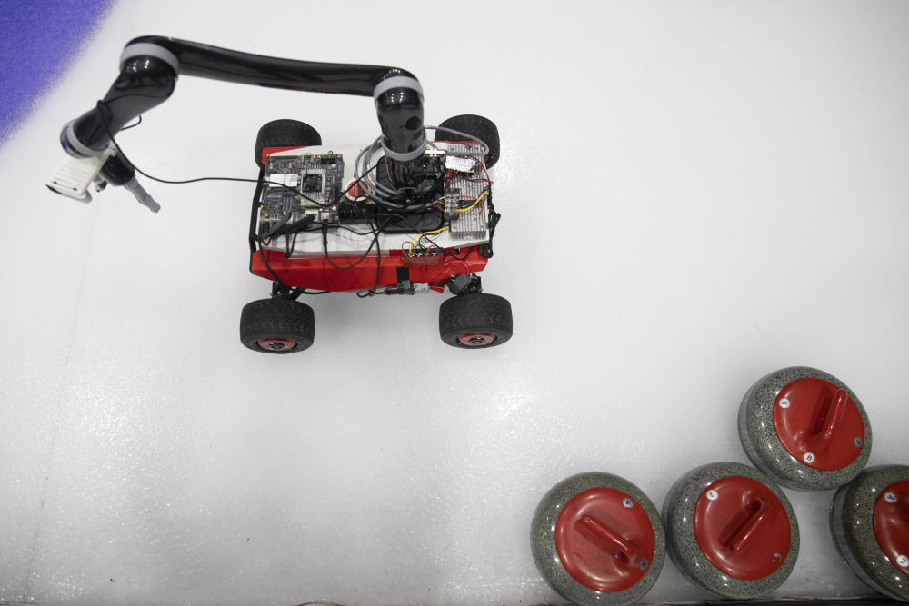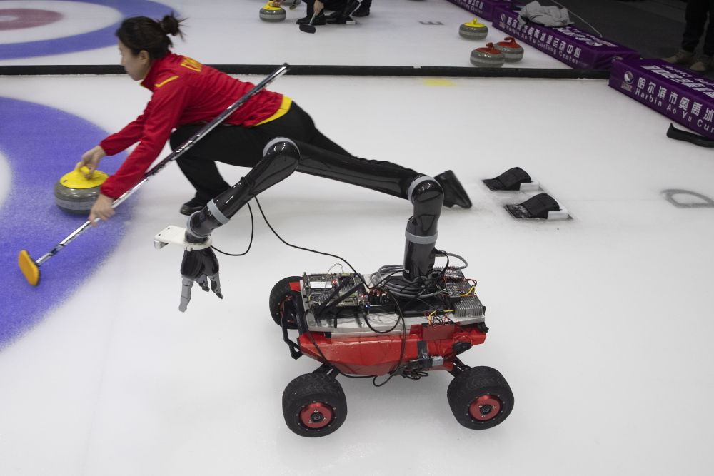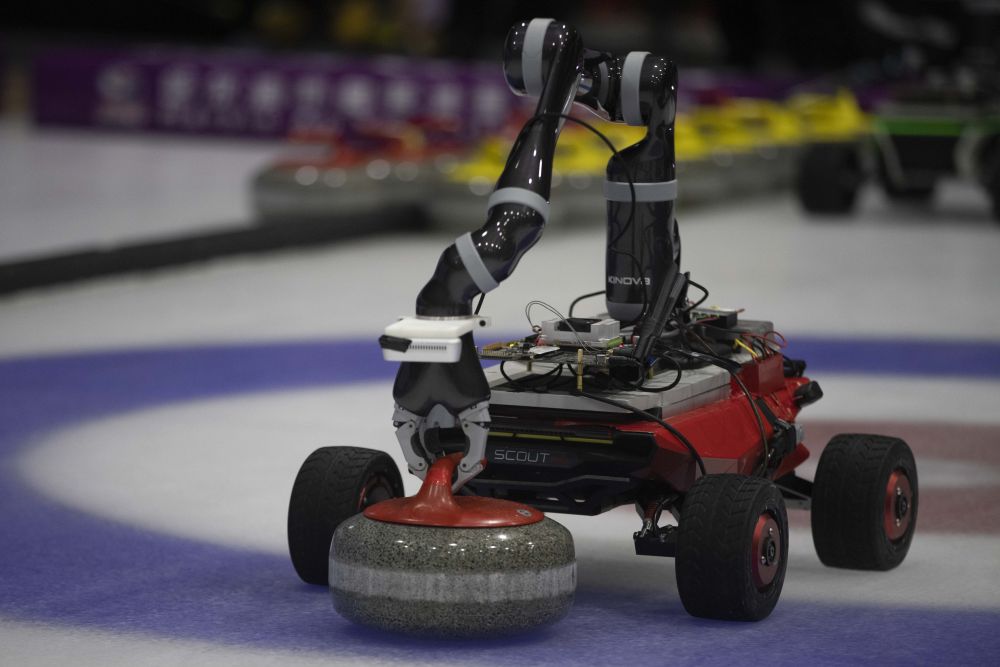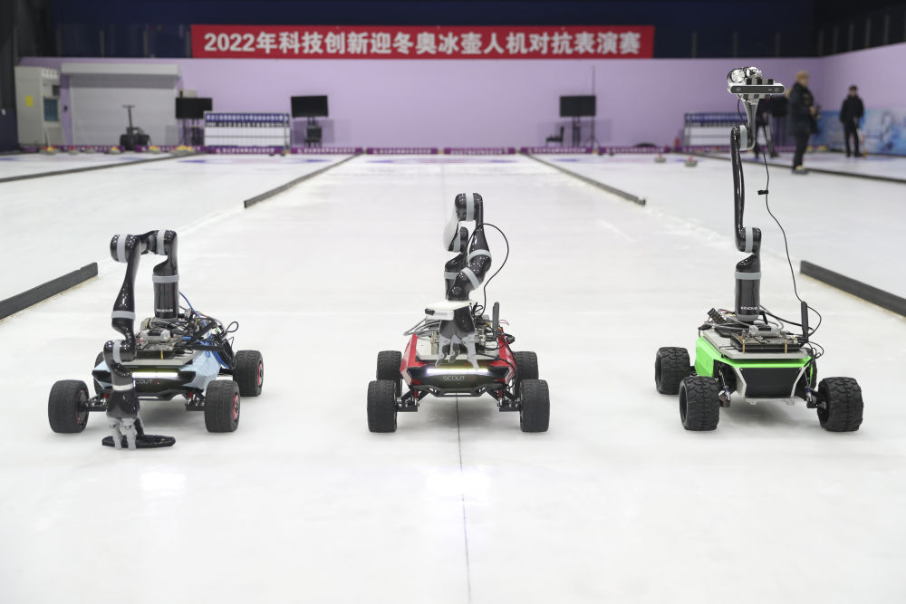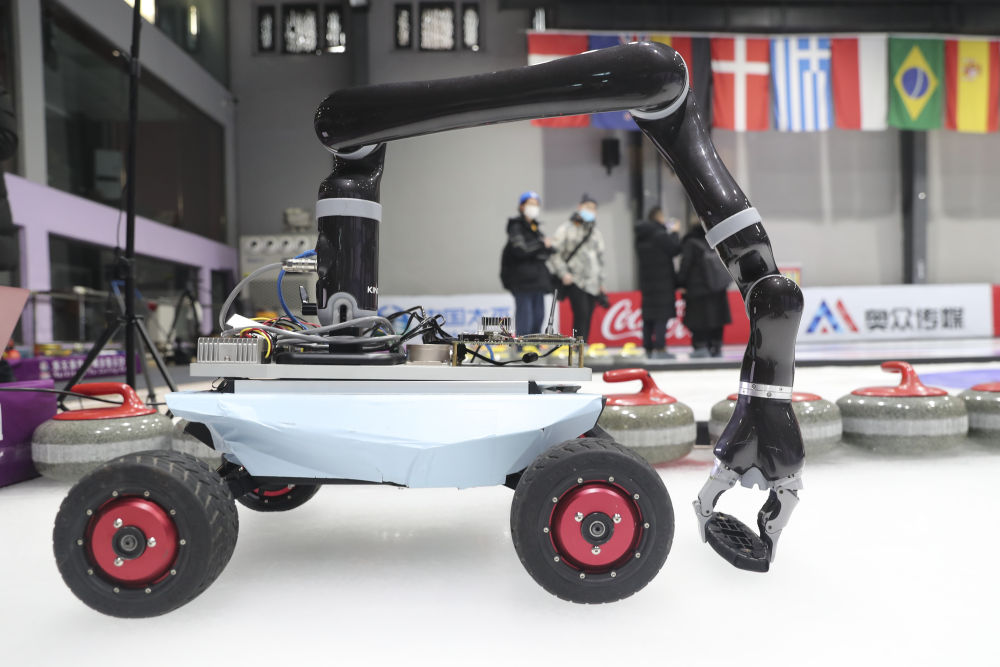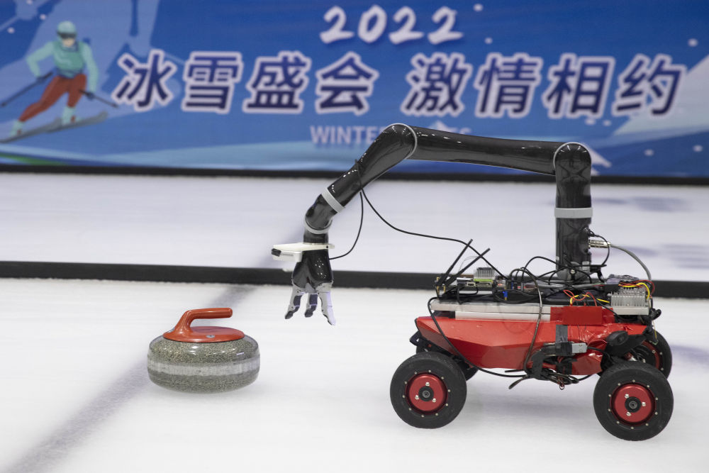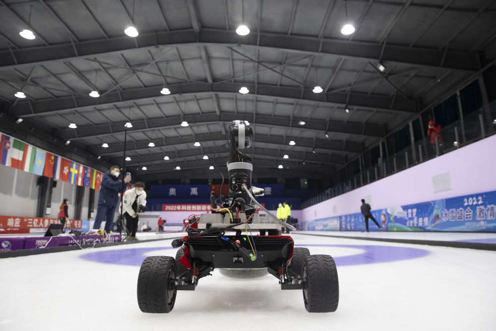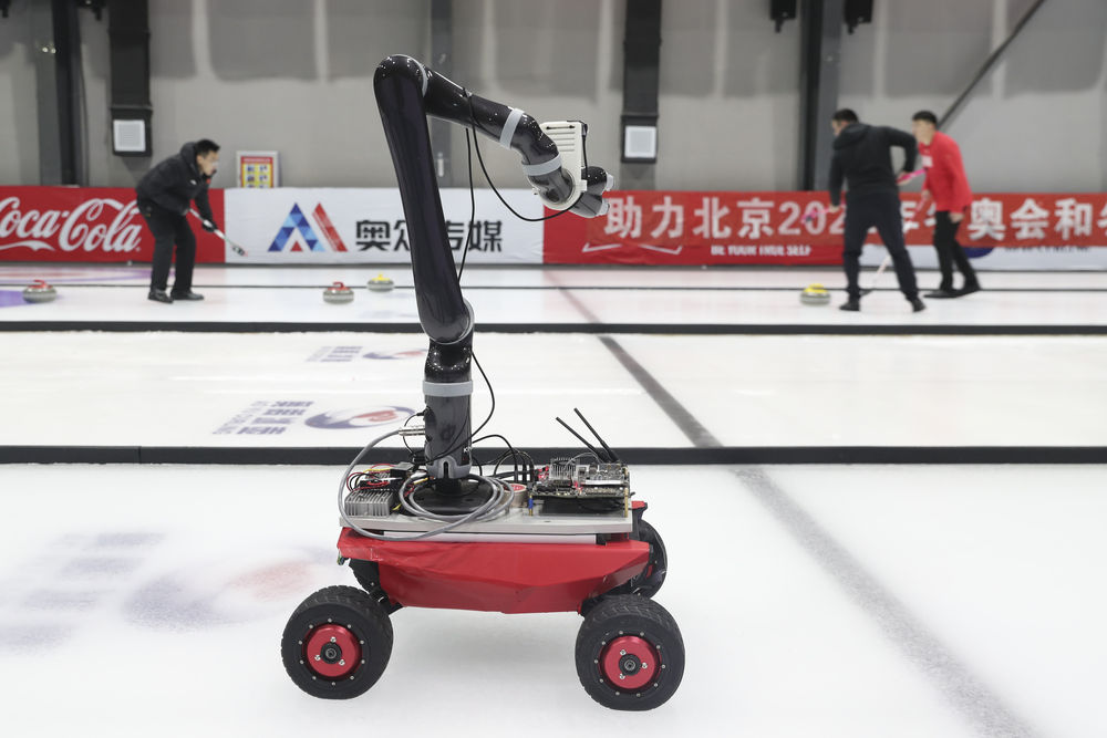 ↑1月28日,智能冰壶机器人准备上场比赛。