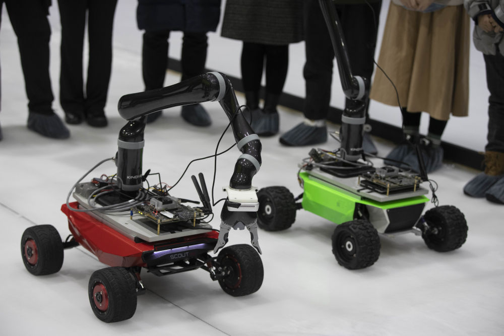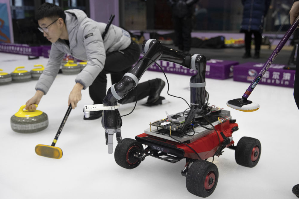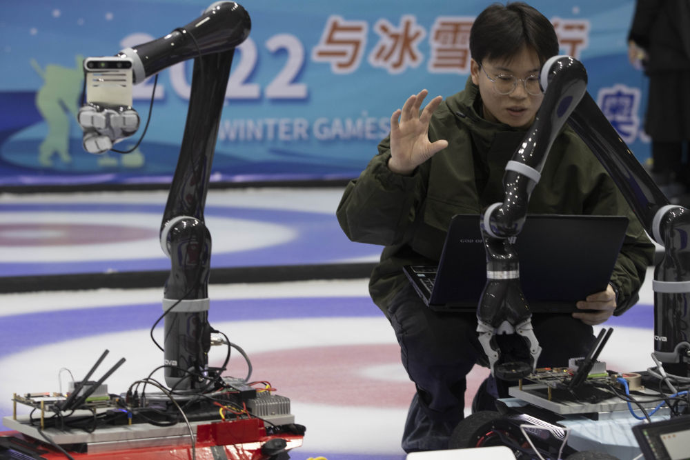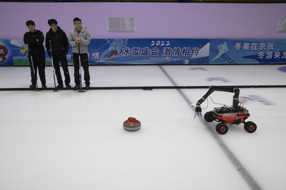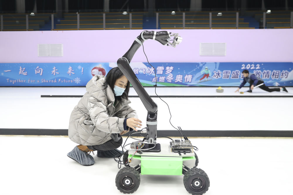 ↑1月28日,工作人员正在调试智能冰壶机器人。