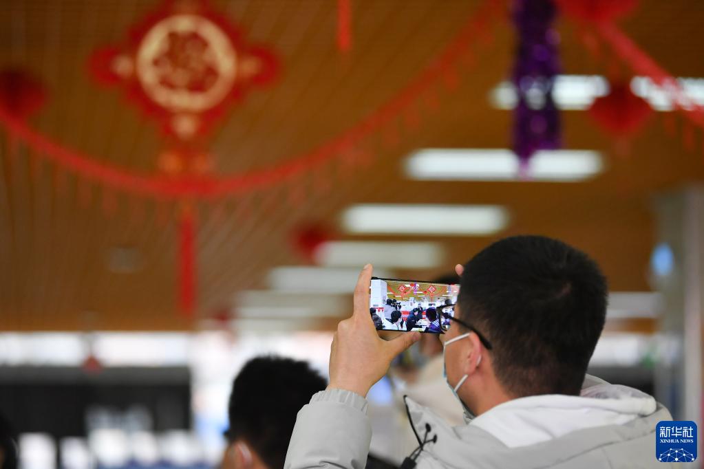 1月29日,西安交通大学兴庆校区,一名留校学生拍摄礼包发放现场。