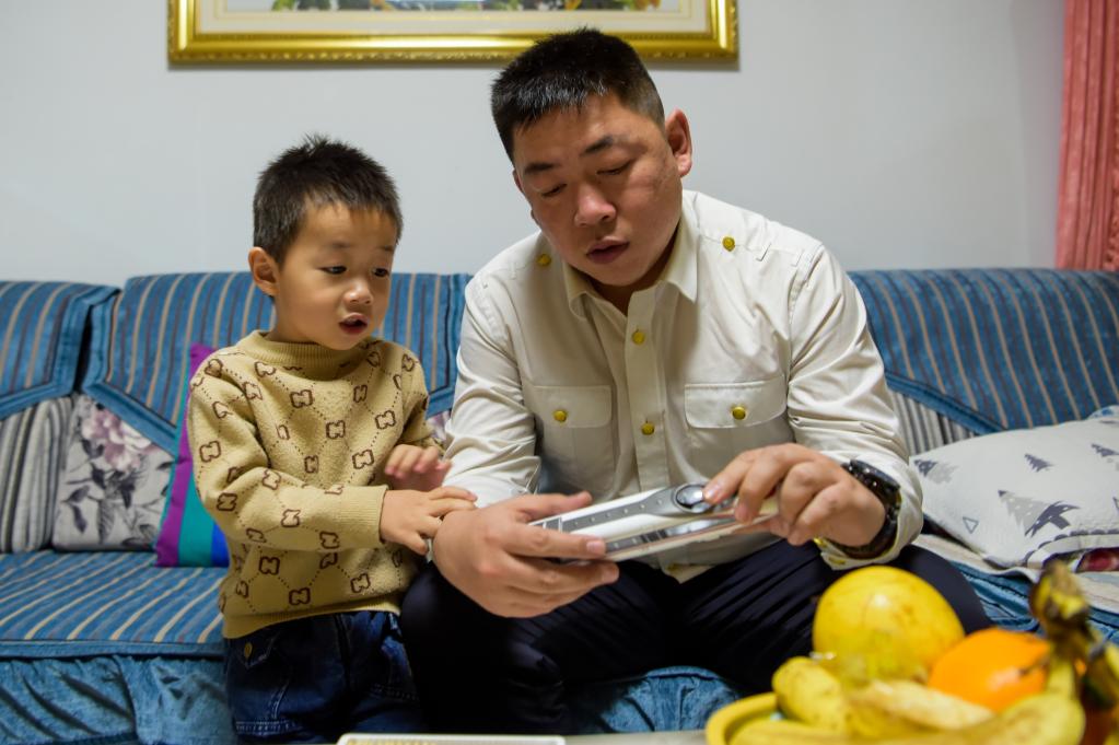 ↑万晓龙(右)在家中向儿子讲解火车知识。新华社记者 李志鹏 摄
