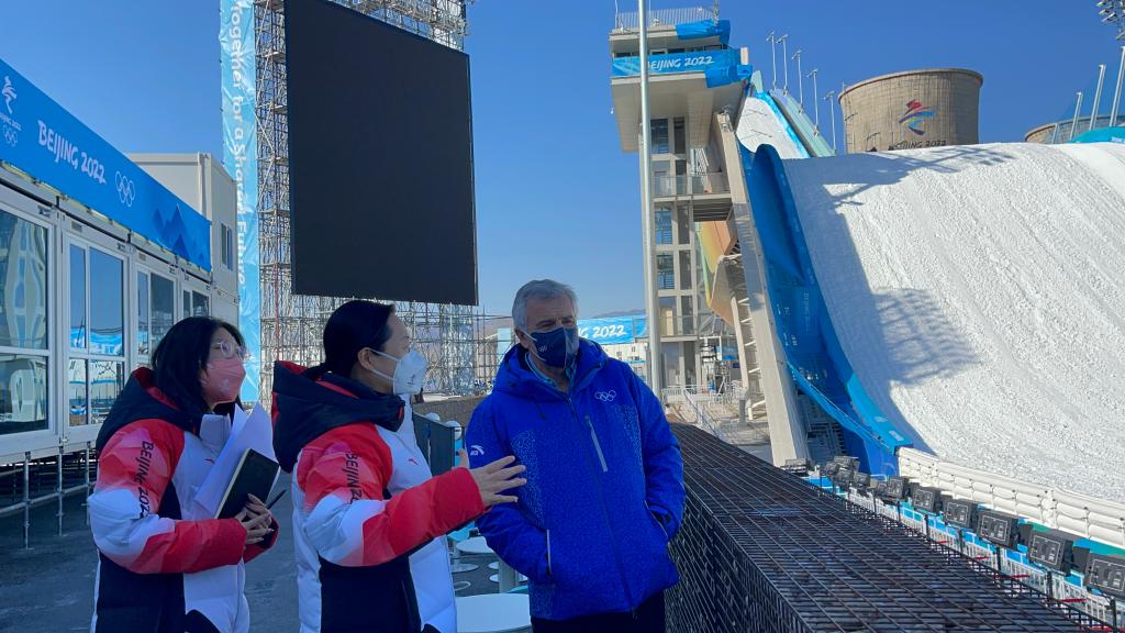 随后,他到大跳台运动员出发区,自48米高处俯瞰起跳台和周边风景。场馆主任宋世媛向他介绍大跳台场馆整体建设、团队准备工作以及首钢园的变迁过程,小萨马兰奇不住地点头称赞。