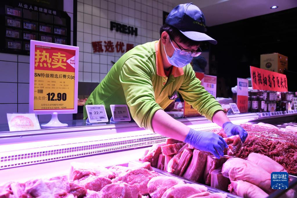 在北京市海淀区一家超市,工作人员码放鲜肉(2021年12月31日摄)。新华社记者 任超 摄