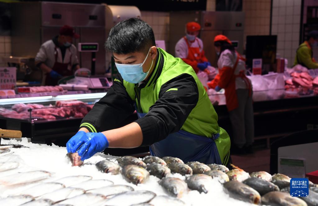 在北京市海淀区一家超市,工作人员码放水产品(2021年12月31日摄)。新华社记者 任超 摄