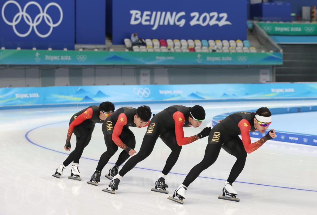 1月29日,中国速度滑冰队队员宁忠岩、廉子文、徐富、王浩田(从右向左)在国家速滑馆“冰丝带”训练。新华社记者 丁旭 摄