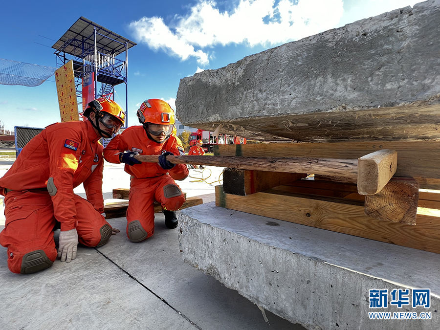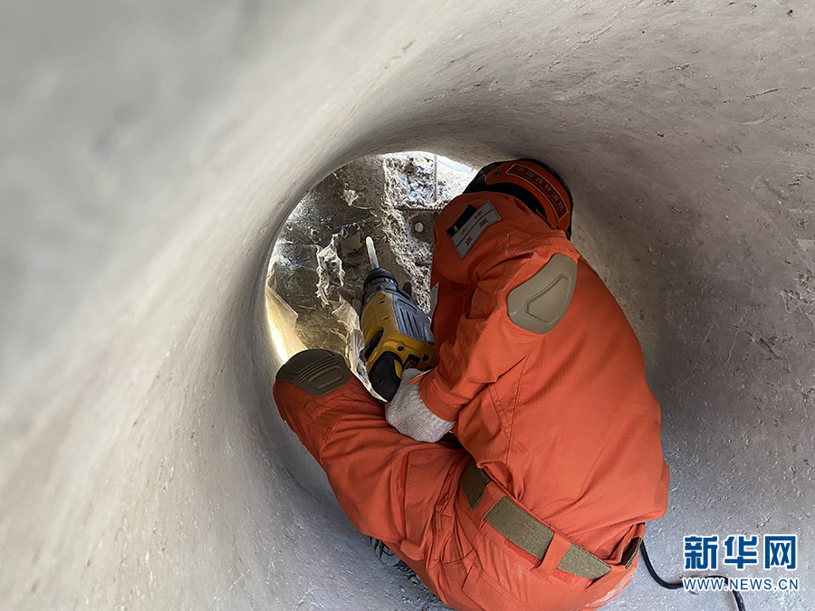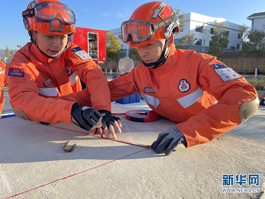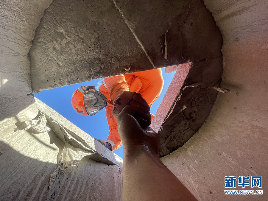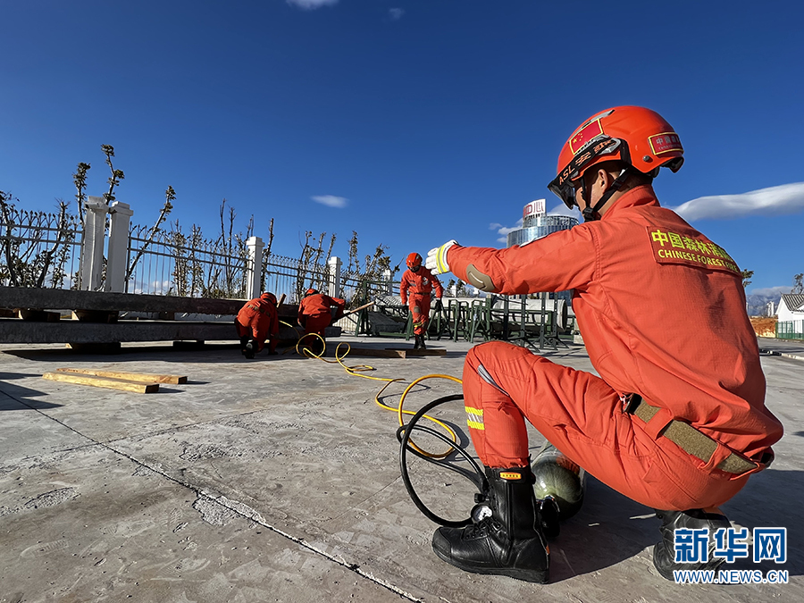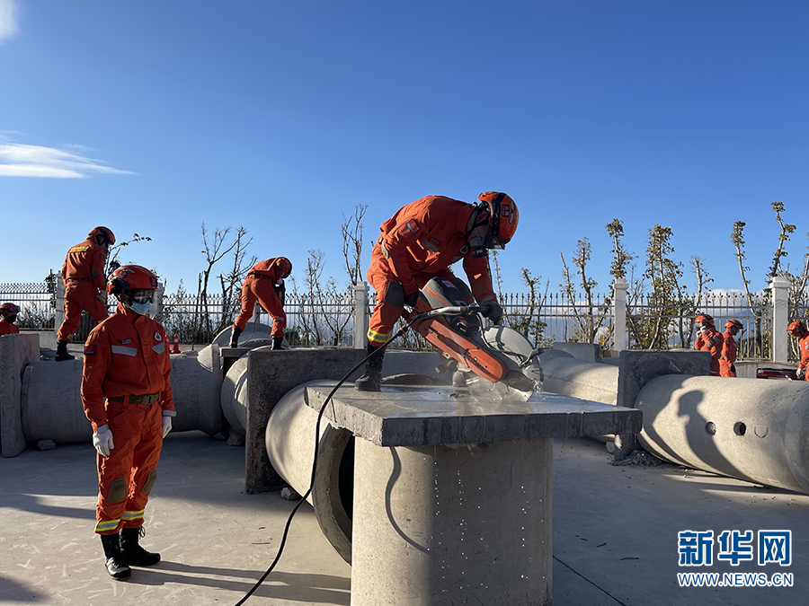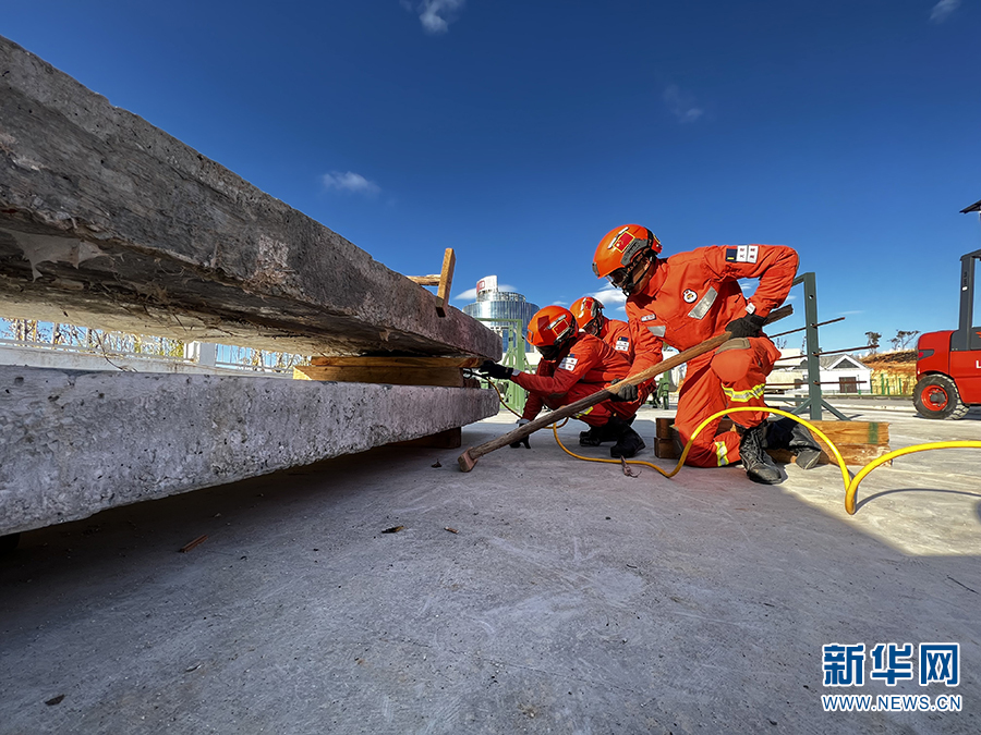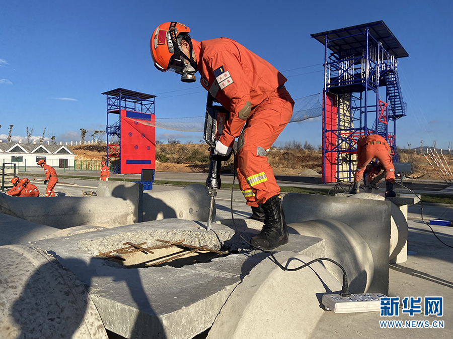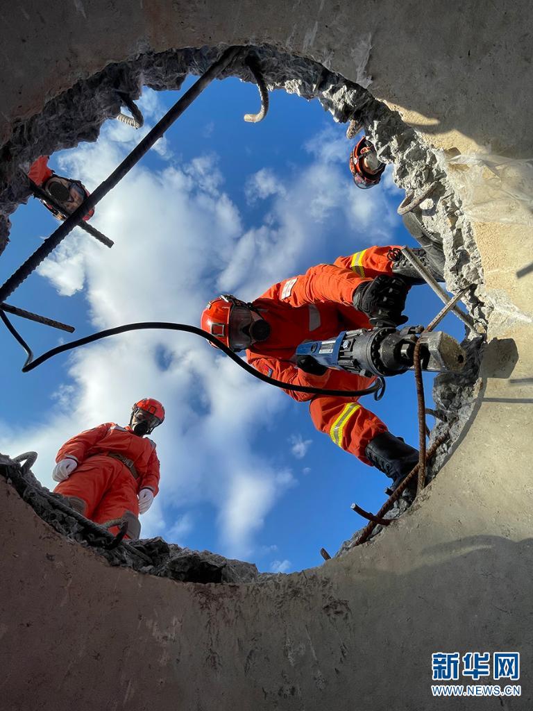 消防救援人员正在利用救援装备进行向下安全破拆(摄于1月20日)。新华网发(杨家辉 摄)