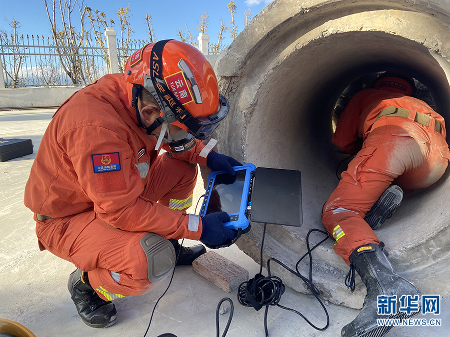 消防救援人员利用生命探测仪在黑暗与夹缝中探寻生的迹象(摄于1月20日)。新华网发(李清 摄)