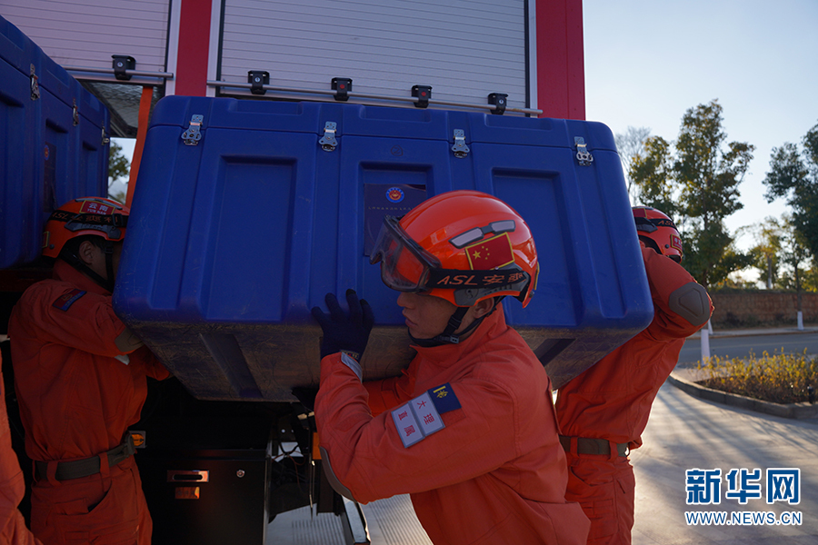 消防救援人员正在搬运救援装备(摄于1月20日)。新华网发(杨运森 摄)