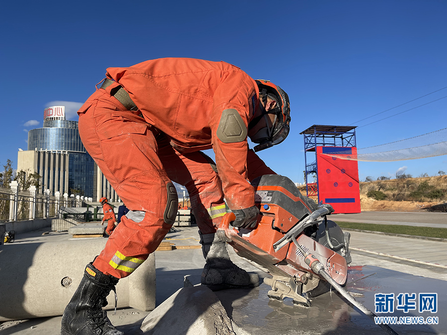 消防救援人员利用救援装备进行破拆(摄于1月20日)。新华网发(杨运森 摄)