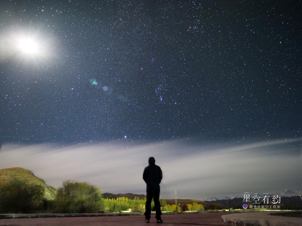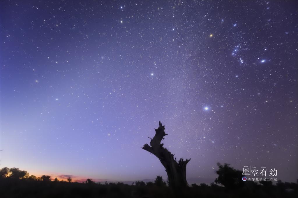 北京市天文爱好者王俊峰2019年10月7日在新疆哈密伊吾胡杨林拍摄的猎户座(参宿三星清晰可见)。(本人供图)