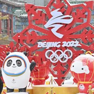 北京前门大街,游客在北京冬奥会景观装饰前留影。新华社记者李鑫摄
