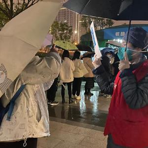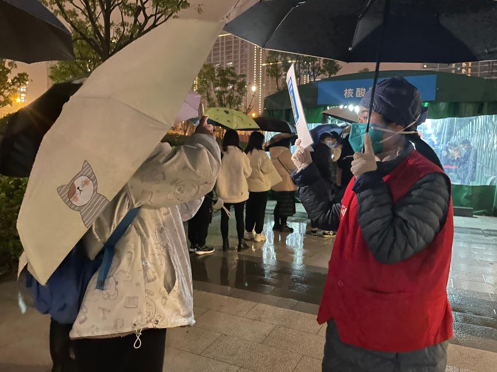 1月28日雪夜,浙大一院户外应急核酸采样点,志愿者们为排队的人群进行咨询服务和扫码登记。(浙大一院宣传中心供图)