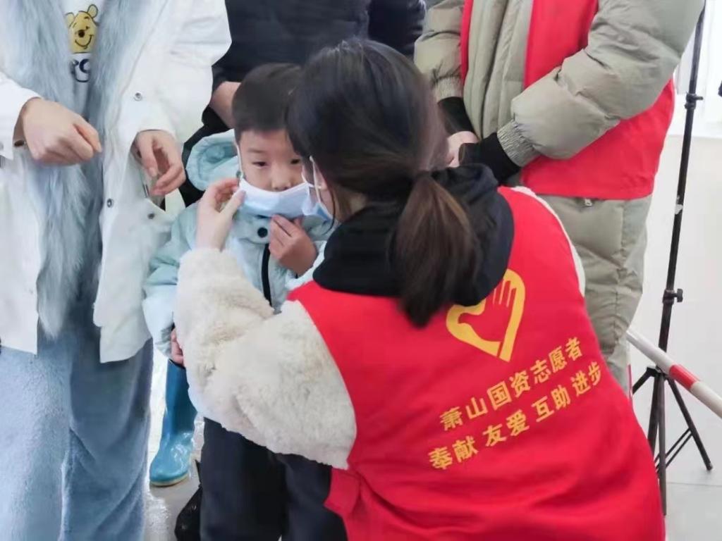 1月27日,杭州萧山区企业青年志愿者在指导来排队核酸检测的小朋友佩戴口罩。(共青团杭州市委员会供图)