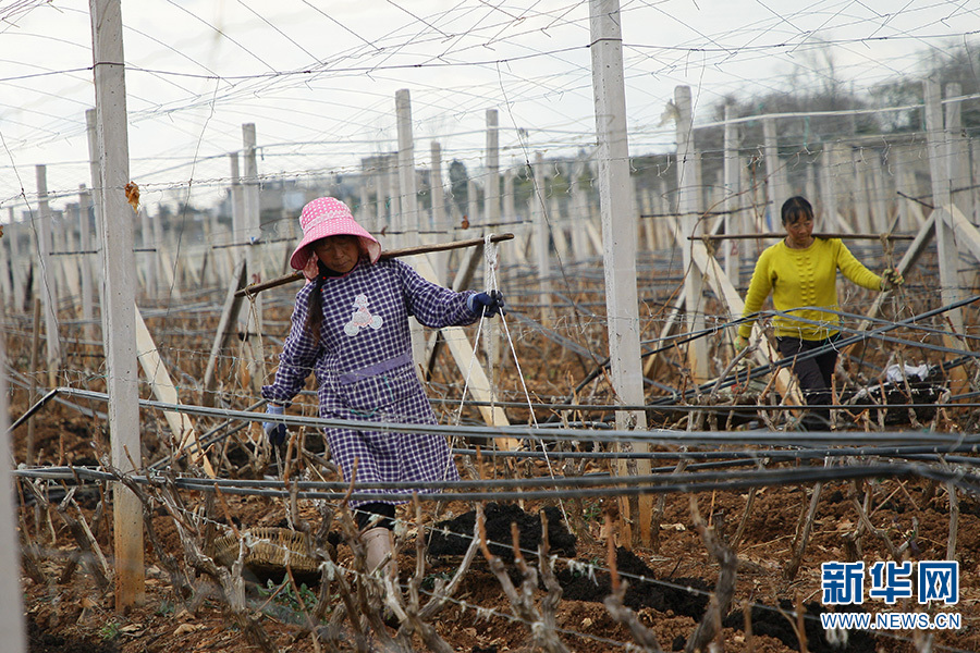 1月19日,云南省曲靖市沾益区金龙华街轩家社区的果农正在葡萄园里施农家肥。