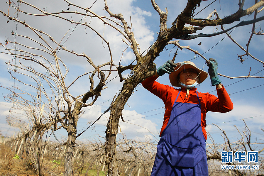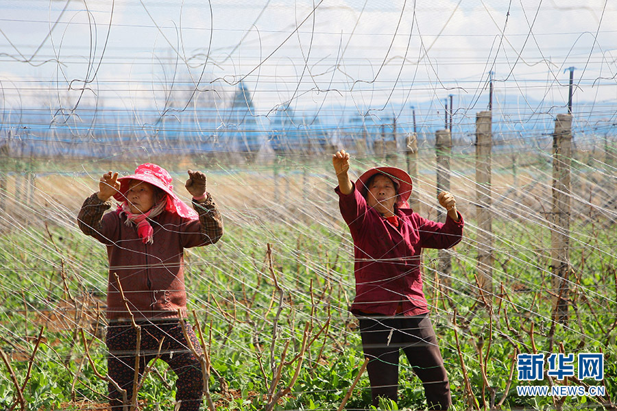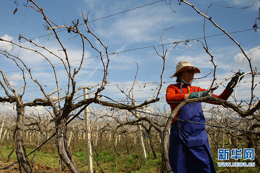 1月19日,云南省曲靖市沾益区金龙华街轩家社区的果农正在葡萄园里修剪枝条。