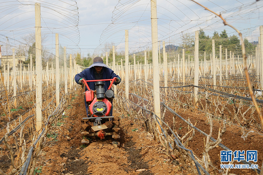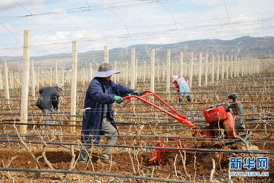 1月19日,云南省曲靖市沾益区金龙华街轩家社区的果农正在葡萄园里用机械翻耕培土。