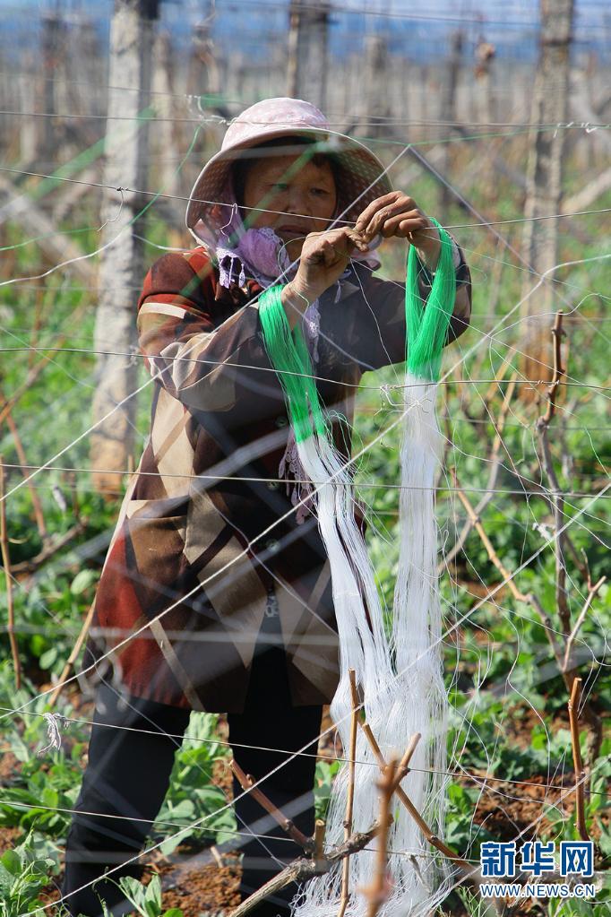 1月19日,云南省曲靖市沾益区龙华街道龙兴社区的菜农正在为豌豆加固爬藤网。