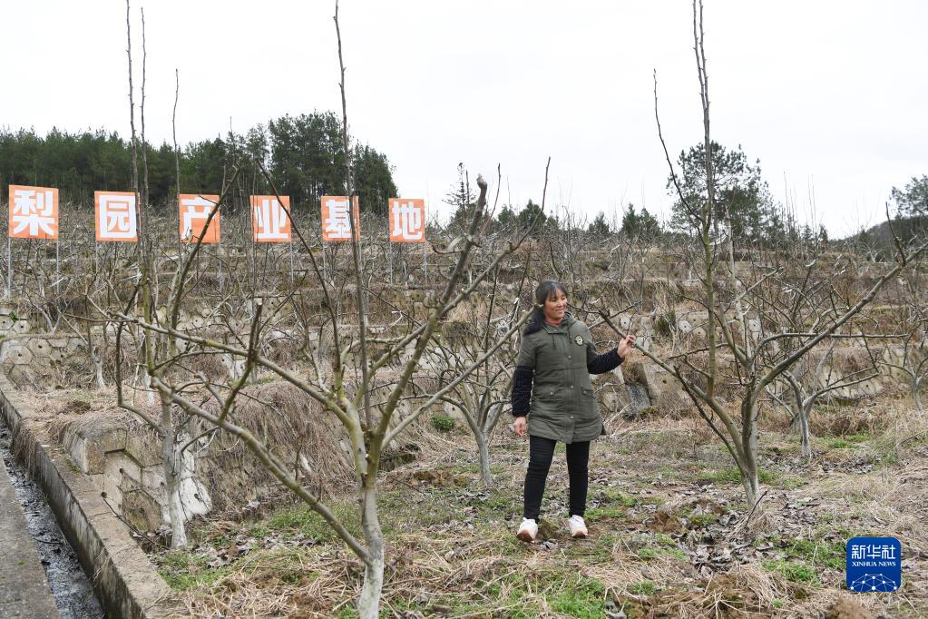 桥头镇田畈村的脱贫户杨小梅在查看梨树生长情况(1月27日摄)。新华社记者 王全超 摄