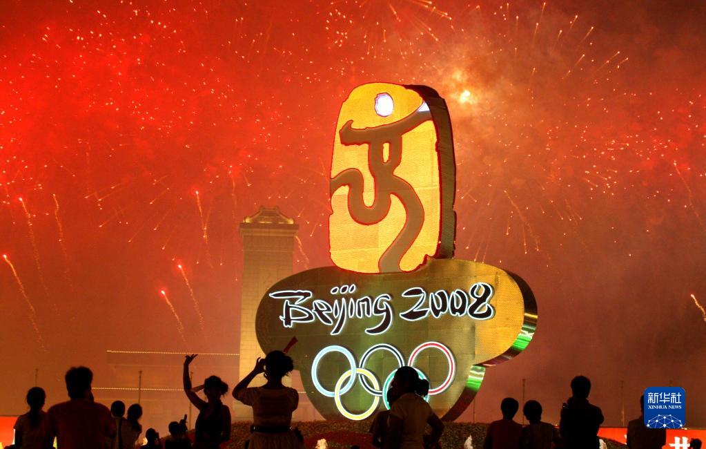 这是2008年8月8日晚,群众在天安门广场观赏焰火。新华社发(吴长青摄)