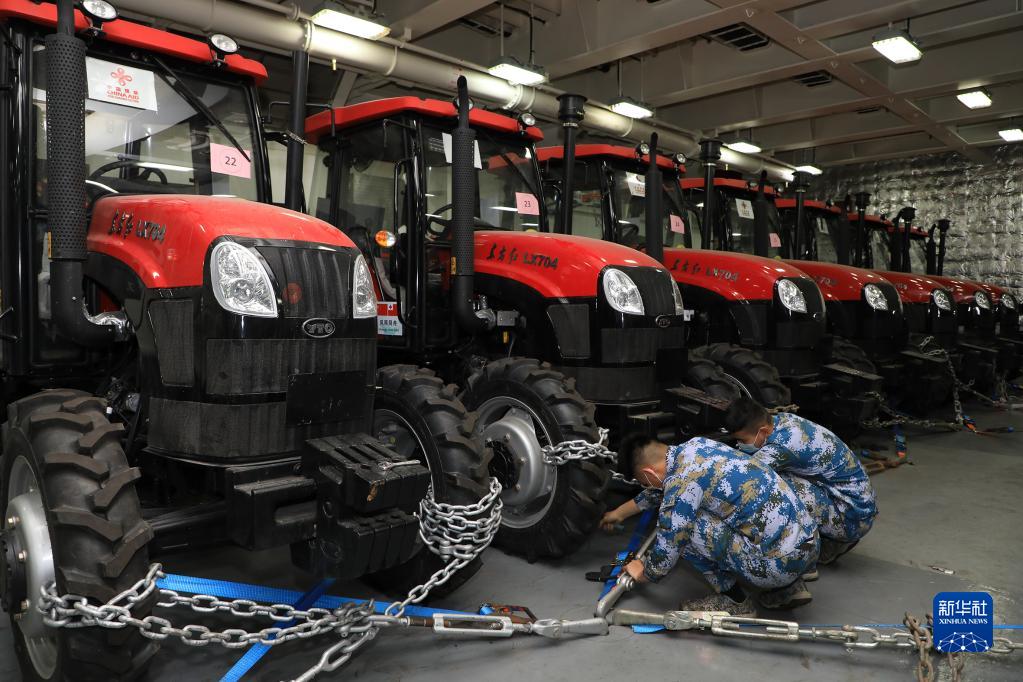 赴汤加执行运送救灾物资任务海上运输编队官兵对救灾物资进行加固(1月30日摄)。