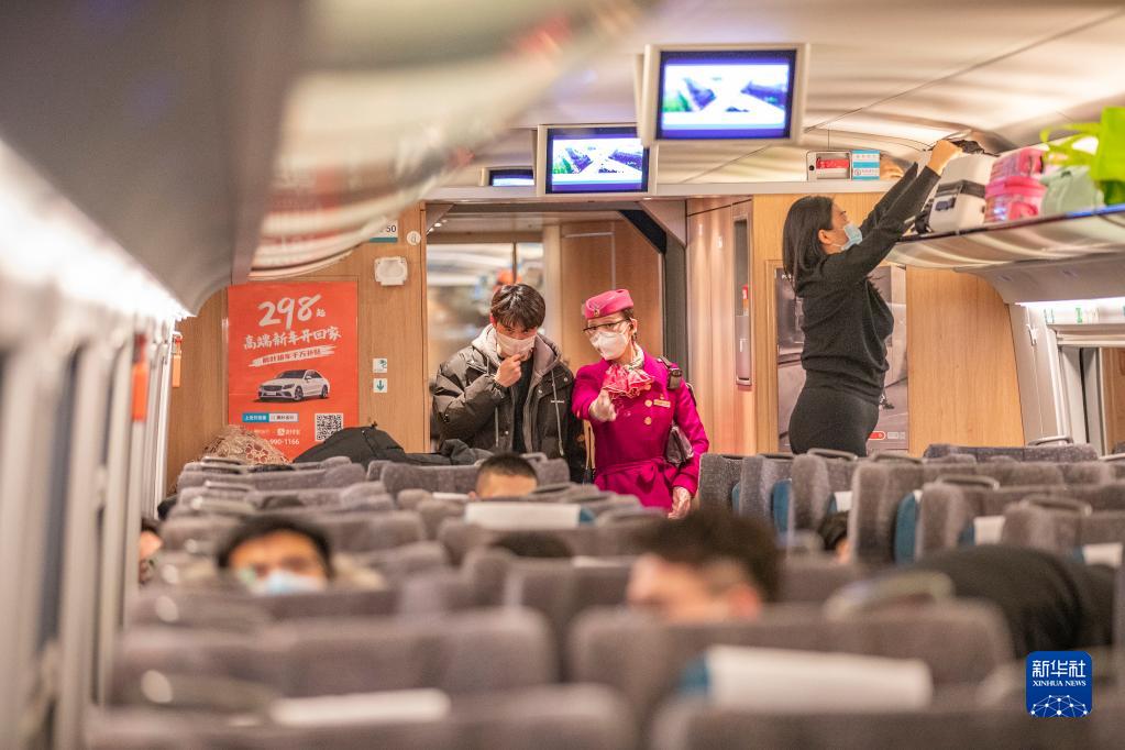 1月30日,在成都东开往万州北的列车上,罗敏在车厢内引导旅客。