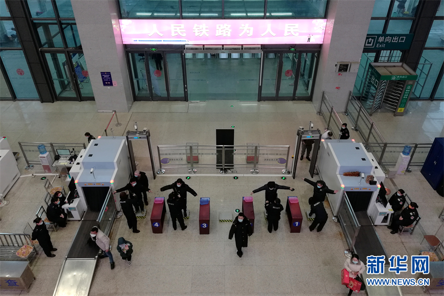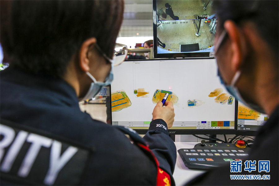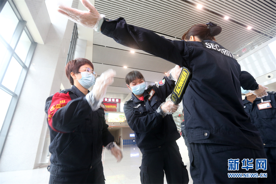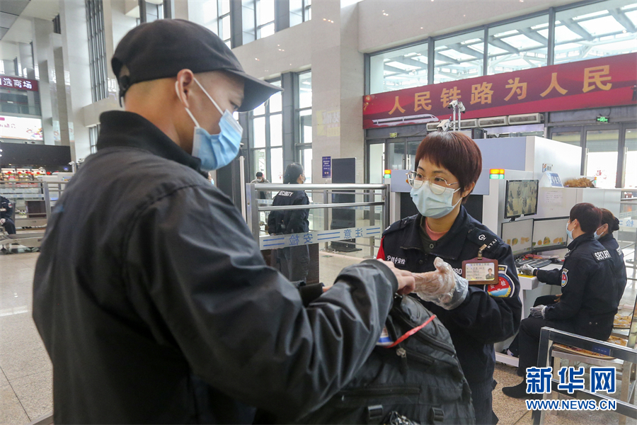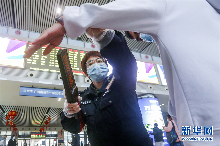安检队员在候车大厅对进入车站的旅客进行安检。