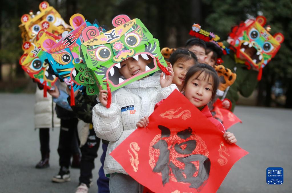 1月22日,在江苏省扬州市茱萸湾风景区,小朋友手持福字和虎头帽为游客送上新春祝福。
