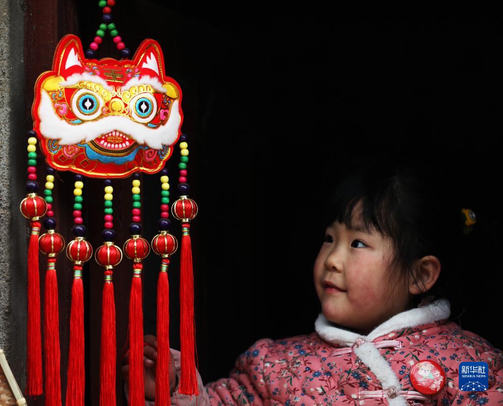 1月20日,在山东省临沂市郯城县红花镇马圩子村,一名小女孩在虎头中国结前驻足。