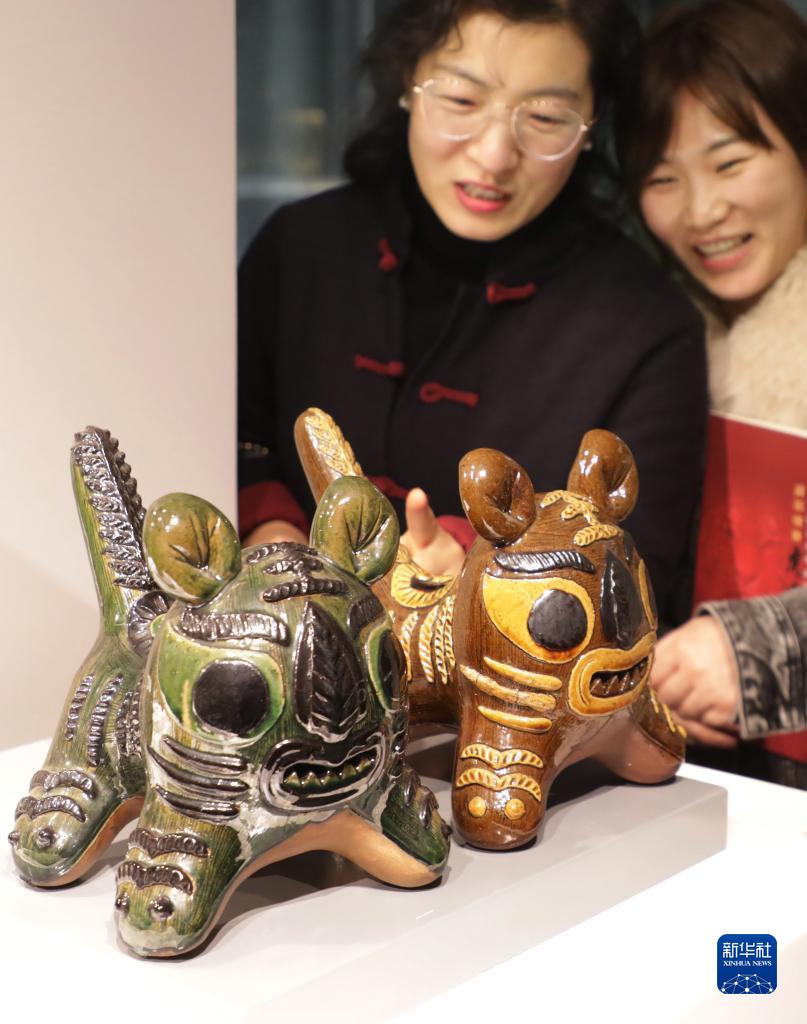 1月19日,在江苏省宜兴市丁蜀镇,市民在观赏以民间传统虎头鞋为蓝本创作的陶瓷《神威虎》。