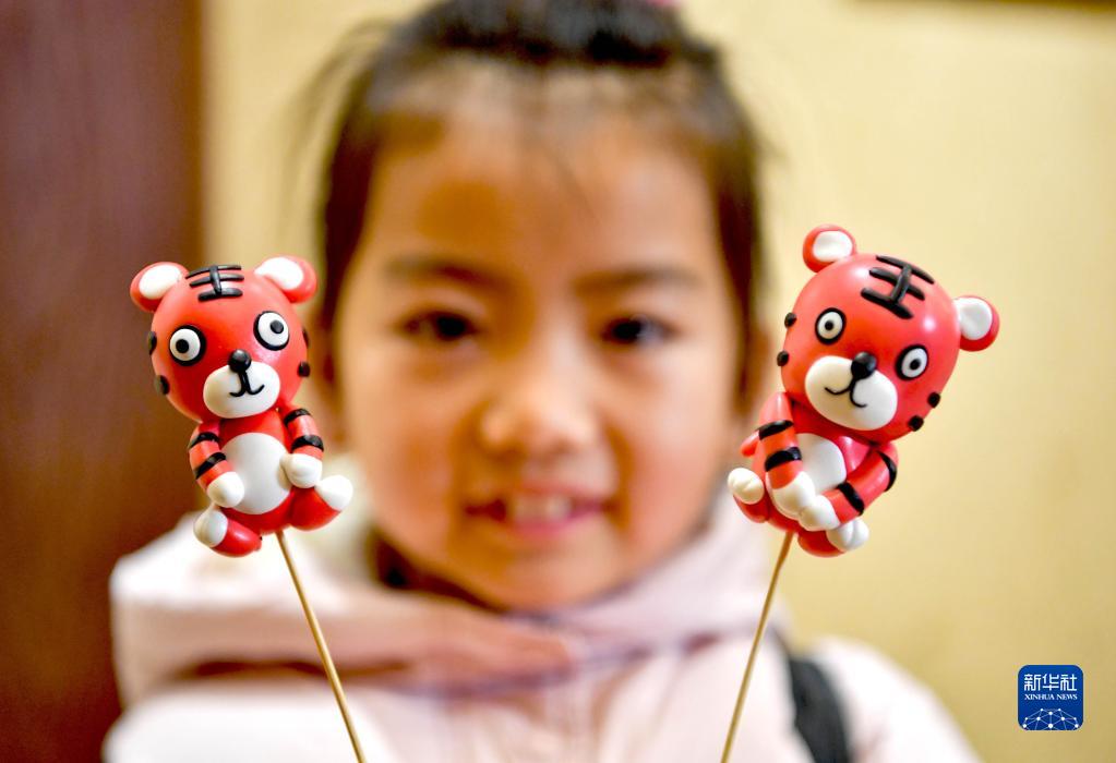 1月18日,在安徽省亳州市花戏楼景区国艺面塑馆,一名小朋友展示刚捏制好的“萌虎”面塑。