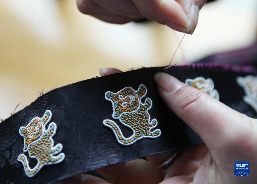 1月12日,在贵州省黔东南苗族侗族自治州雷山县丹江镇猫猫河村,一名绣娘赶制“萌虎”元素文创产品。