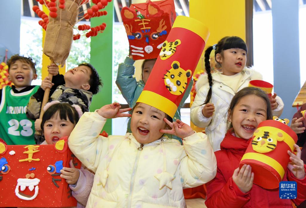 1月12日,福建省武夷山市百花幼儿园的小朋友们在游园活动上穿戴自制的虎元素饰品。