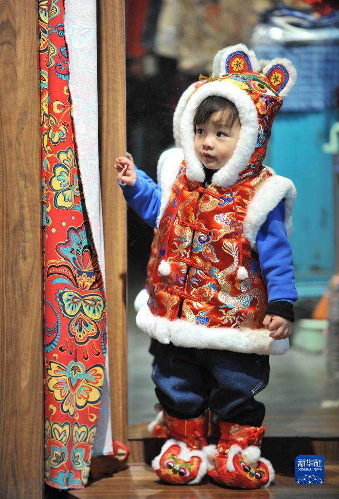 1月24日,在河北省鹿泉市土门关驿道小镇巧手工坊内,一名小朋友身穿虎头袄和虎头鞋。