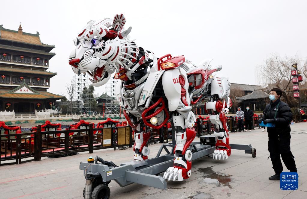 1月23日,在山东省枣庄市台儿庄古城,技术人员在调试安装“动能虎”。该“动能虎”高约3.6米、体重约1.8吨,集激光、3D全息等于一体,能模仿虎的行走、捕食、吼叫等。