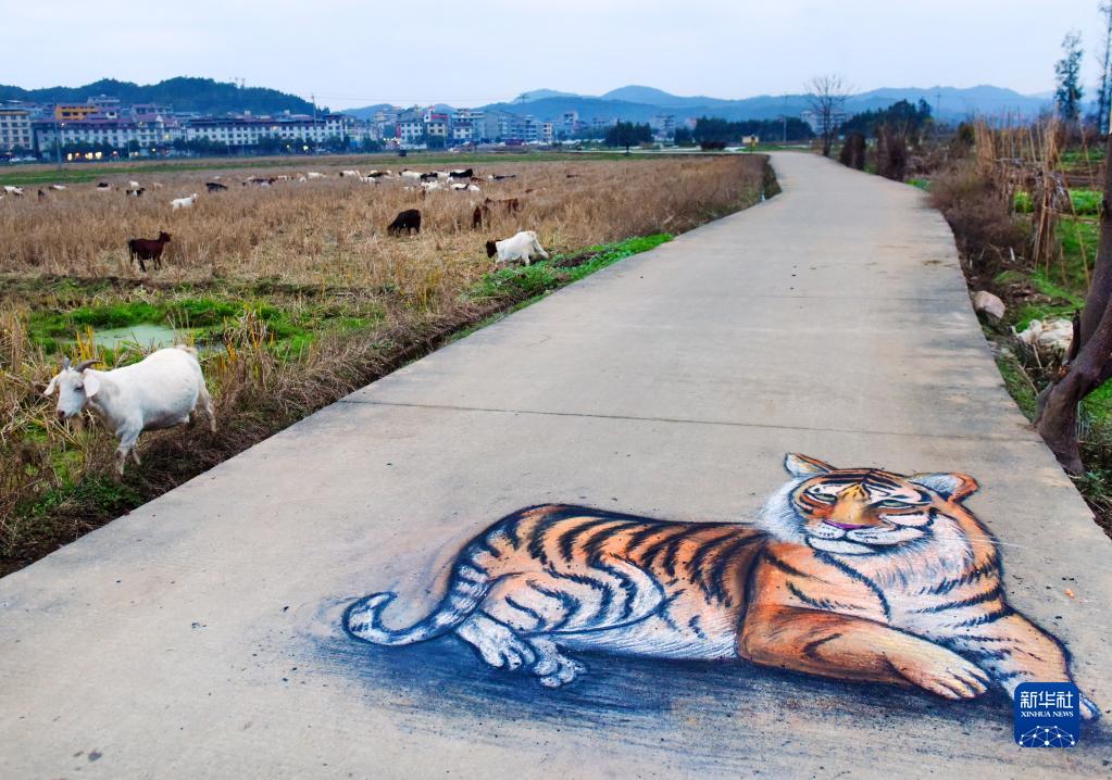 1月20日,在福建省南平市建阳区徐市镇田间小路上,一只羊从3D立体画《老虎》边上经过。该3D立体画由一名“90后”绘画爱好者以木炭和粉笔绘制。