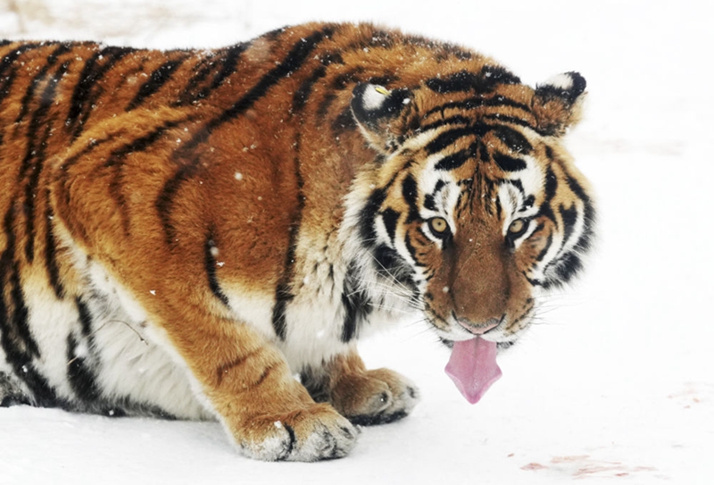1月15日,黑龙江东北虎林园的东北虎在雪地上休息。新华社记者 王建威 摄