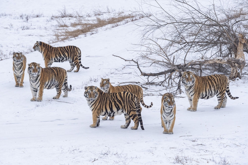 对了,忘了跟大家介绍,我的地盘就在吉林省珲春市那嘎达——东北虎豹国家公园。咳咳,这可不是普通的公园,而是为了更好地保护俺们野生东北虎、东北豹,专门建设的国家公园哦。它横跨吉林、黑龙江两省,规划面积14065平方公里,森林覆盖率97.74%,从2017年8月试点到2021年10月正式设立,俺们野生东北虎家族可谓“虎丁兴旺”。现在,俺们的数量已经由试点之初的27只,增长到现在的50只了!