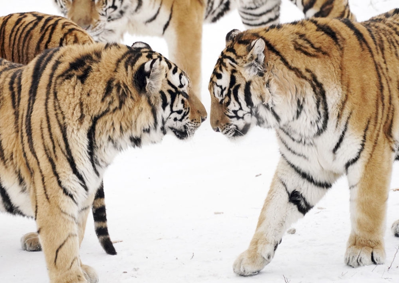 1月15日,黑龙江东北虎林园的两只东北虎在互动。新华社记者 王建威 摄
