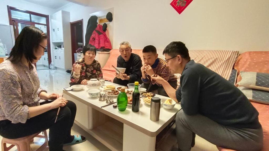 陆增文和家人在吃年夜饭。(受访者供图)