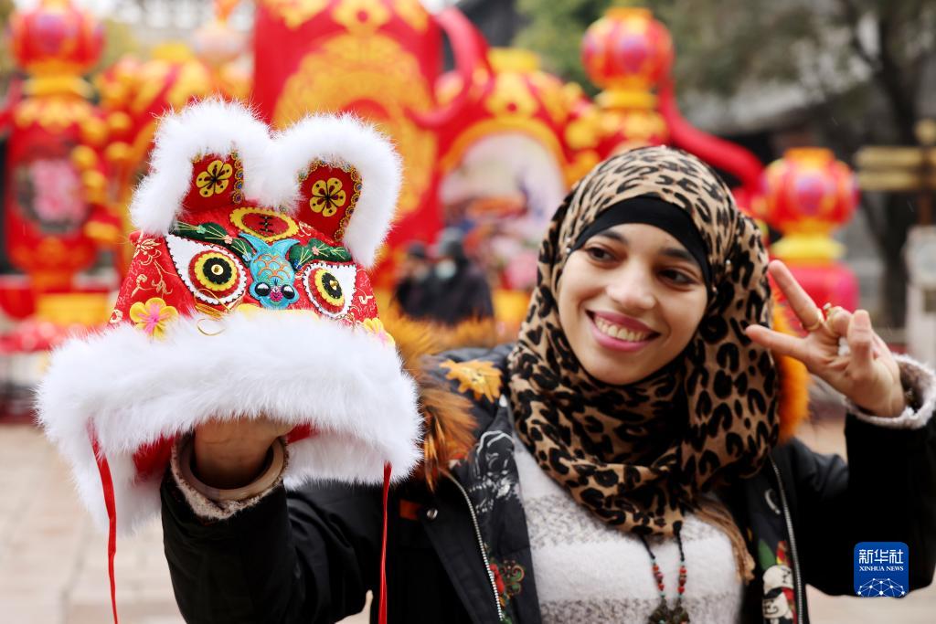 1月22日,来自埃及的“洋媳妇”艾米娜在山东省枣庄市台儿庄古城展示中国传统虎头帽。艾米娜已嫁到台儿庄10多年,喜爱中国的传统文化。新华社发(孙中喆摄)