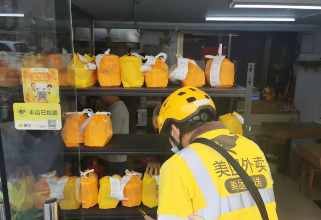 图为外卖小哥在开放式餐架取餐。(受访者供图)