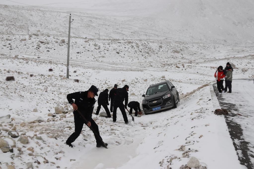 珠峰边境派出所移民管理警察帮助游客救援车辆。(受访单位供图)