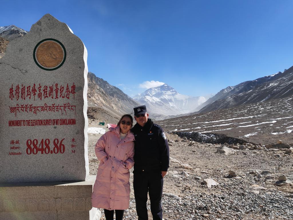 赵天豪和妻子朱皎在珠峰高程测量纪念碑前合影(2022年1月25日 摄)。(受访者供图)
