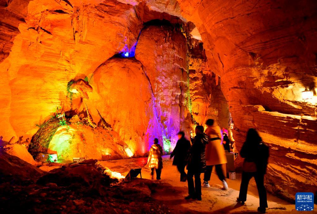 2月3日,游客在湖北省宣恩县锣圈岩地质公园的溶洞里游玩。