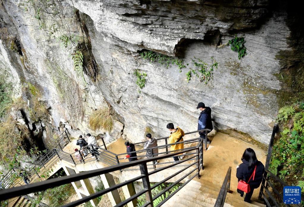 2月3日,游客在湖北省宣恩县锣圈岩地质公园的天坑里游玩。