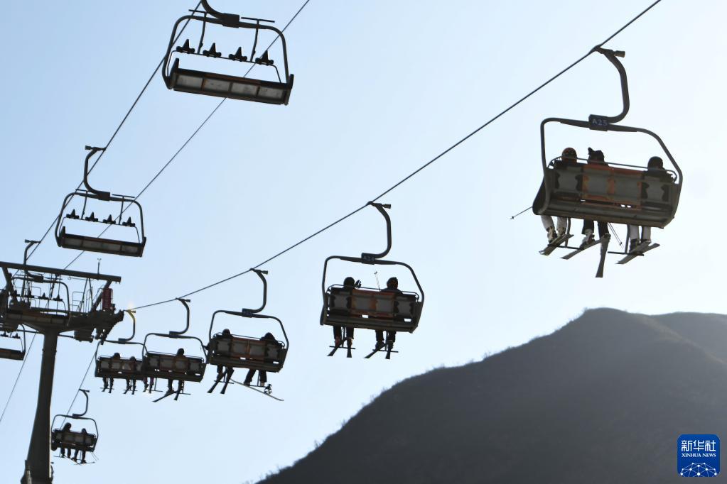 2月3日,游客在甘肃省永靖县凤凰岭滑雪场乘坐缆车。